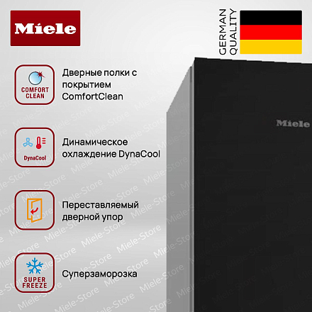 Внешний вид подчеркивает премиальность: строгие линии, лаконичные детали и современная цветовая гамма гармонично вписываются в самые разные стилистические решения. Эргономичная ручка и продуманная организация пространства делают использование максимально удобным. Благодаря системе Side-by-Side, холодильник может быть установлен в паре с другим прибором Miele, создавая единую композицию. Высота в 201,5 см и ширина 60 см позволяют рационально использовать пространство кухни, а регулируемые ножки обеспечивают устойчивость даже на неровных поверхностях. Особое внимание уделено внутреннему оснащению. Вместительный холодильный отсек объемом 268 литров и морозильная камера на 103 литра позволяют хранить значительные запасы продуктов. Для овощей и фруктов предусмотрен отдельный ящик DailyFresh с оптимальным уровнем влажности, что способствует более длительному сохранению свежести. Внутри камеры предусмотрены стеклянные полки с возможностью регулировки по высоте, что позволяет легко размещать крупные кастрюли и высокие бутылки. Отделения на дверце обеспечивают дополнительное пространство для соусов, напитков и мелких упаковок.