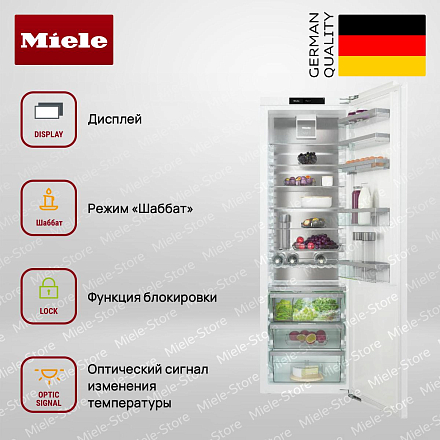 Встраиваемый холодильник Miele K 7777 B – это идеальное сочетание элегантного дизайна и передовых технологий. Его изысканный внешний вид гармонично впишется в интерьер любой кухни, благодаря чему он станет неотъемлемой частью вашего пространства. Этот прибор изготовлен в Германии, что гарантирует его высокое качество и надежность. Высота устройства составляет 177 см, ширина 55.9 см, а глубина 54.6 см, что позволяет ему легко интегрироваться в кухонный гарнитур. Конструкция ComfortSize позволяет разместить противень на нижнем уровне, что добавляет удобства в использовании. Дверь снабжена петлями справа, а система SoftClose и SelfClose обеспечивают плавное и тихое закрытие.