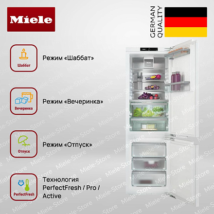 Модель оснащена специальными режимами: «Шаббат» для соблюдения традиций, «Вечеринка» для интенсивного охлаждения напитков и «Отпуск» для минимизации энергопотребления при длительном отсутствии. Дверные полки ComfortClean легко снимаются и моются, что способствует поддержанию идеальной чистоты внутри. Система SoftClose обеспечивает мягкое и бесшумное закрывание дверей, а SelfClose — автоматическое доведение до полного закрытия. Конструкция ComfortSize позволяет размещать на нижнем уровне противень, что особенно удобно при хранении крупногабаритных блюд или заготовок.