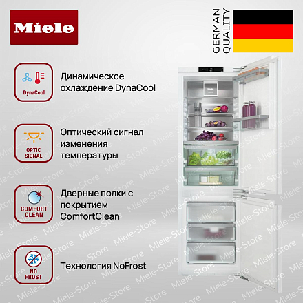 Встраиваемый холодильник с морозильником Miele KFN 7774 B — гармоничное сочетание немецкого качества, инновационных технологий и продуманного современного дизайна. Модель выполнена в лаконичном стиле, что позволяет ей органично вписаться в любую кухонную мебель. Высота конструкции составляет 177 см, ширина — 55,9 см, а глубина — 54,6 см, благодаря чему техника идеально подходит для ниш стандартных размеров. Слайдерное крепление фасада обеспечивает надежную фиксацию и легкость монтажа, а максимальный вес дверцы до 18 кг позволяет использовать даже массивные панели. Элегантное внутреннее пространство, отделанное безопасным стеклом и покрытием CleanSteel, выглядит стильно и легко очищается от отпечатков и загрязнений.