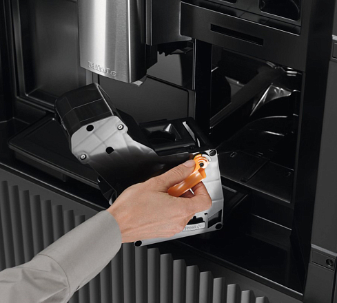 Кофемашина Miele CVA7440 OBSW относится к встраиваемому типу. Корпус в цвете «черный обсидиан» прекрасно сочетается как со светлой, так и с темной мебелью. Техника не занимает много места и облегчает готовку напитков. Модель работает как с зерновым, так и с молотым кофе. Специальная коническая мельница сохраняет аромат зерен.