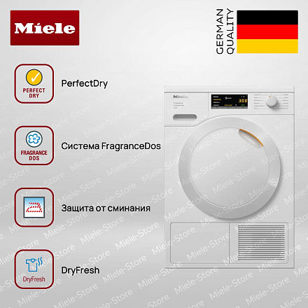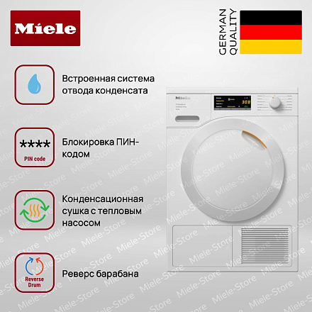 Сушильная машина Miele TEA525WP оформлена в цвете «белый лотос» и вписывается в линейку Chrome Edition, где продуманная эстетика сочетается с функциональной строгостью: белая дверца с аккуратной отделкой и прямая панель управления создают лаконичный образ, подходящий к интерьеру любого кухонного или хозяйственного пространства. Дисплей EasyControl и поворотный переключатель обеспечивают быстрый доступ к 12 программам, среди которых хлопок, деликатная, шерсть, джинсы и экспресс, а также режимы для постельного белья и сорочек; отложенный старт до 24 часов позволяет планировать процесс, индикаторы остаточного времени, очистки фильтра и необходимости опустошить ёмкость для конденсата информируют о ходе работы. Конденсационный принцип с тепловой помпой в паре с технологиями PerfectDry и EcoDry оптимизирует расход энергии и обеспечивает высокий класс A+++, при этом класс сушки A гарантирует качественный результат при нагрузке до 8 кг; нержавеющий барабан с LED-подсветкой и сотовой структурой бережно обращается с тканями, а реверс барабана уменьшает сминание.