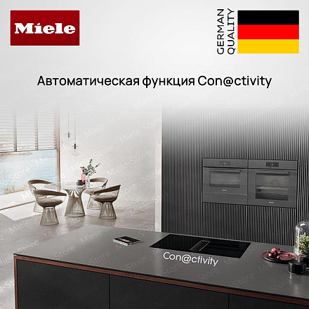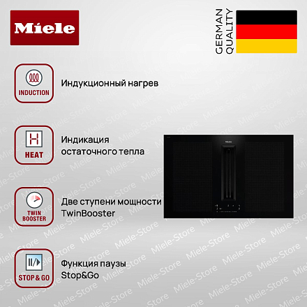 Miele KMDA 7676-1 FL — современное решение для тех, кто ценит минимализм и технологичность на кухне: индукционная поверхность с интегрированной вытяжкой объединяет функциональность и строгую эстетику. Чёрная стеклокерамика подчёркивает мебельный интерьер, накладной вариант без рамы позволяет выполнить встраивание заподлицо, а защитная решётка выполнена в чёрном цвете, что обеспечивает единство оформления. Четыре конфорки оснащены интеллектуальными зонами PowerFlex в двух размерах для гибкой расстановки посуды: две зоны PowerFlex (150×230 мм с номинальной мощностью 2 100 Вт и режимом Booster до 3 000 Вт, TwinBooster до 3 650 Вт — позиция левая; две крупные зоны 230×460 мм с мощностью по 3 400 Вт, Booster до 4 800 Вт и TwinBooster до 7 300 Вт — правая позиция) дают возможность готовить в крупных ёмкостях или одновременно на нескольких поверхностях.