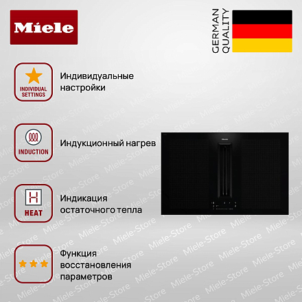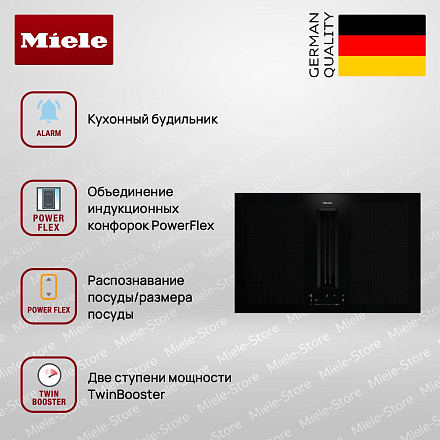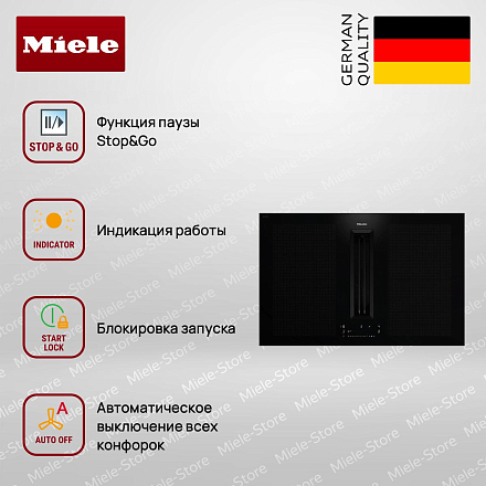 Также есть функции PowerFlex и TwinBooster, которые обеспечивают максимальную эффективность и гибкость при приготовлении пищи. Но это не все. Индукционная панель Miele KMDA 7676 FL оборудована встроенной вытяжкой, которая обеспечивает эффективное удаление запахов и дыма. Мощность вытяжки варьируется от 195 м³/ч на минимальной скорости до 610 м³/ч на интенсивной ступени. Уровень шума при этом остается приемлемым, не превышая 53 дБ на максимальной скорости. Встроенный охлаждающий вентилятор, защита от перегрева и индикатор остаточного тепла обеспечивают безопасность использования панели. Блокировка запуска и функция защитного отключения предотвращают случайное включение или перегрев устройства.