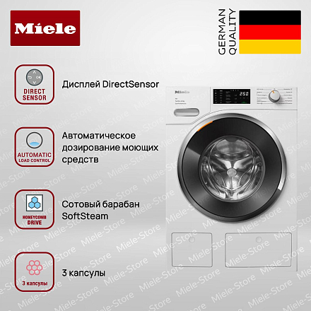 В некоторые модели Miele входит набор из 3 капсулы, содержащие специализированные моющие или ухаживающие средства. Капсула WoolCare разработана для шерсти и кашемира, минимизируя риск их деформации или усадки. Капсула для стирки спортивной одежды эффективно и бережно удаляет пятна и запахи пота, не нарушая материал. Капсула с кондиционером для белья AQUA придаёт вещам мягкость, свежесть и приятный аромат.