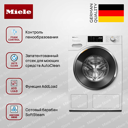 Стиральная машина Miele WWG 880 WCS — образец продуманного дизайна и инженерного качества, выполненный в оттенке «белый лотос» и рассчитанный на 9 кг белья. Наклонная панель под углом 5° с сенсорным дисплеем DirectSensor обеспечивает удобство управления и читаемость, а правый дверной упор добавляет эргономики при загрузке. Корпус органично вписывается в любые интерьеры, подходит для установки в колонну, размещения Side-by-Side или под столешницу, что делает аппарат универсальным решением как для встроенных гарнитуров, так и для отдельного размещения. Внешняя лаконичность сочетается со строгой продуманностью элементов: крупный люк дает удобный доступ, уплотнения выполнены с заботой о долговечности, а аккуратная отделка подчеркивает премиальность.